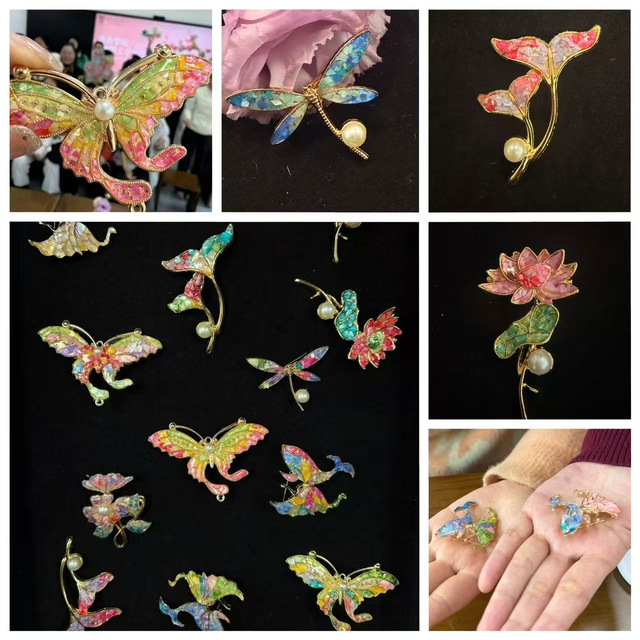 在创作环节中,老师们化身“手作匠人”,全身心投入非遗技艺的体验之中。在螺钿首饰制作时,大家小心翼翼地挑选各色螺片,细细研磨、精准粘贴,在胶水与螺片的交融间,耐心勾勒着独属于自己的美好;宋锦